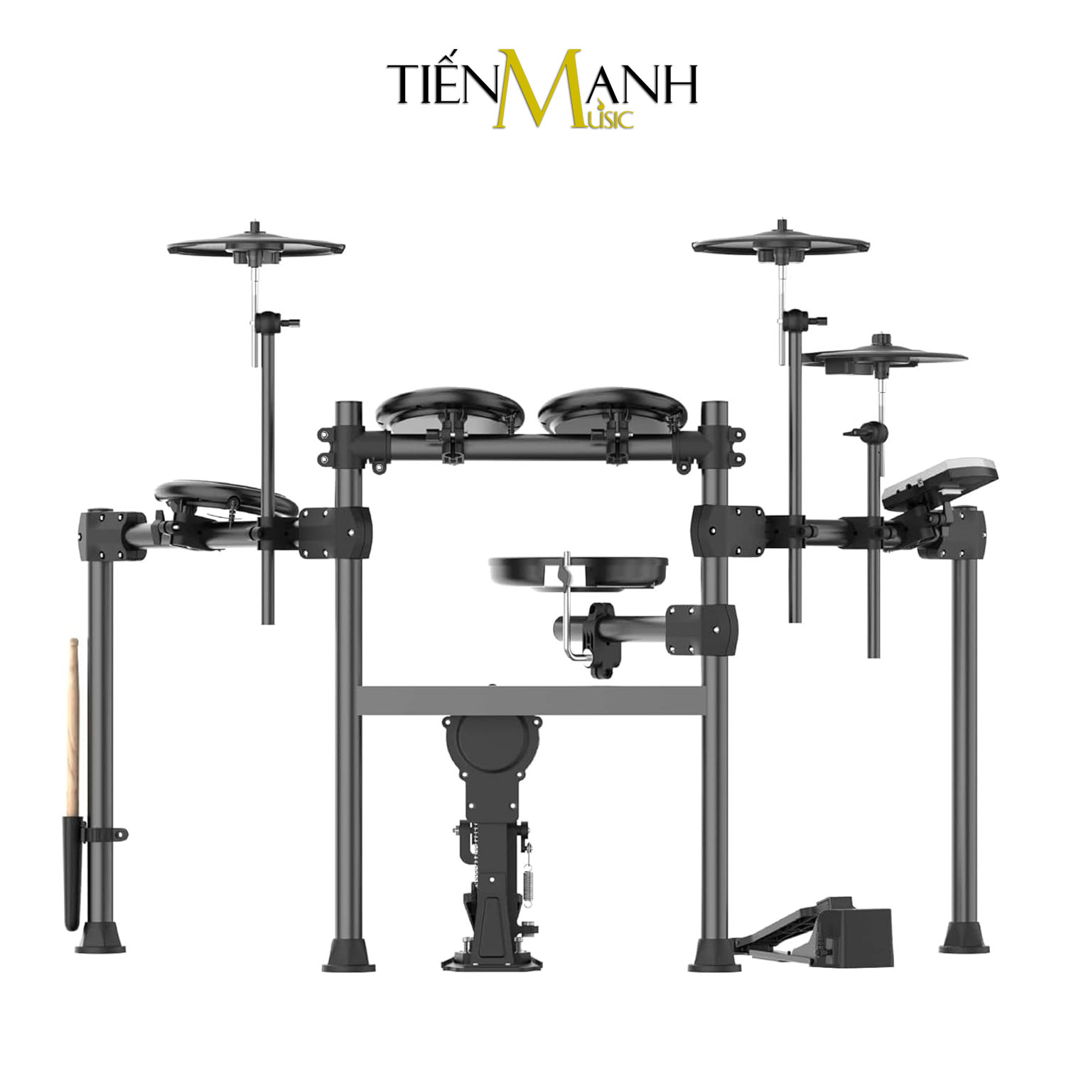 *Trống: - 5 mặt trống: Snare (8", mesh, double triggers), Bass (silicone, bàn đạp cơ), và 3 toms (6", silicone). *Chũm chọe: - 3 loại: Hi-hat, Crash (10", silicone nửa vòng, chức năng tắt âm), và Ride (10", silicone nửa vòng, chức năng tắt âm).