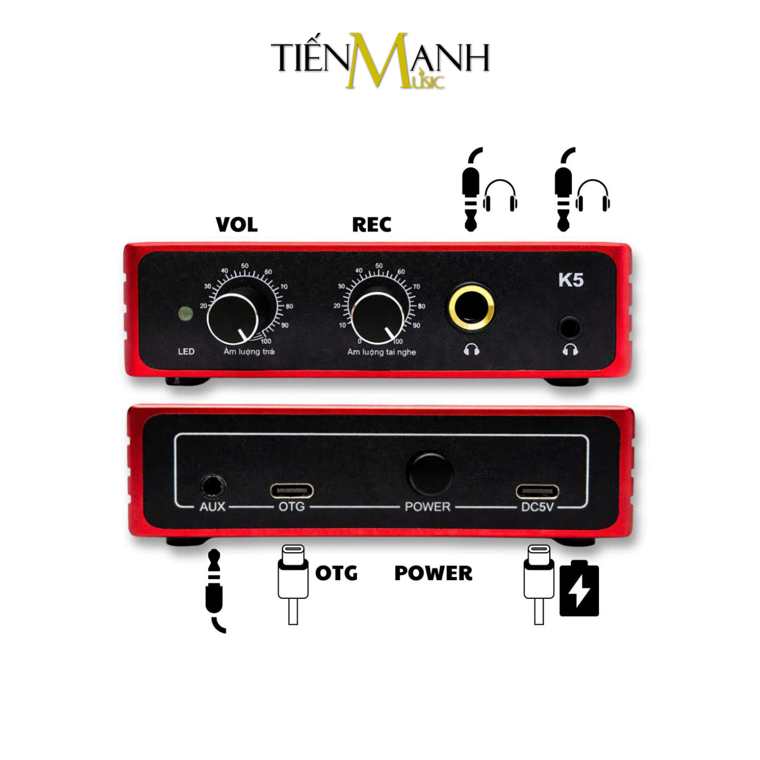 - Nút điều chỉnh: Gain mic, nhạc nền, monitor, master volume